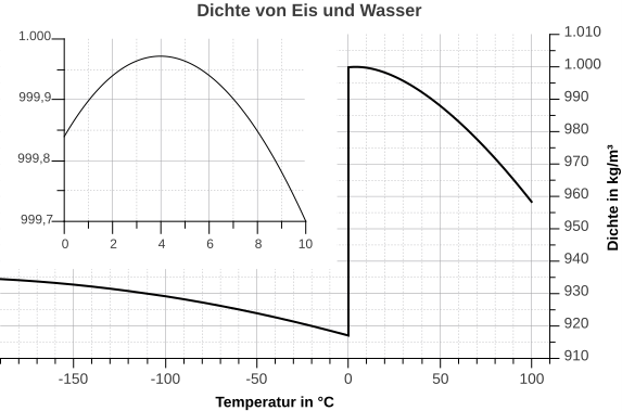 Die Dichte des Wassers steigt mit sinkender Temperatur (wie das bei den meisten Stoffen der Fall ist). Bei 4 °C ist allerdings das Maximum erreicht und die Dichte sinkt dann bis zu 0 °C leicht ab (siehe vergrößerter Ausschnitt). Bei 0 °C (Gefrierpunkt) fällt die Dichte rapide ab, das Wasser dehnt sich also beim Gefrieren stark aus (um ca. 10 %). Mit weiter sinkender Temperatur steigt die Dichte des Eises wieder kontinuierlich an, wird aber niemals so hoch wie in flüssigem Zustand.